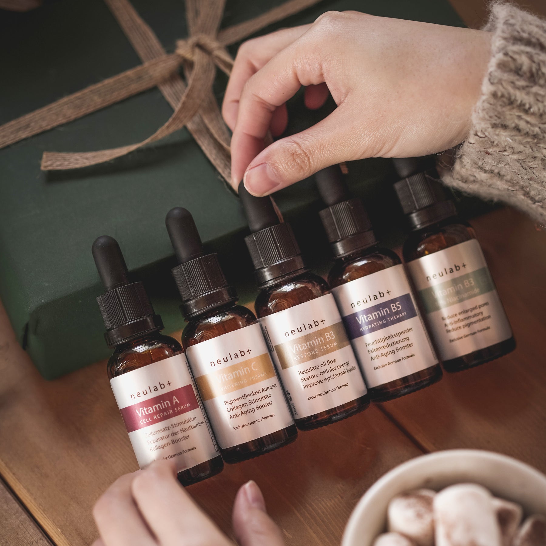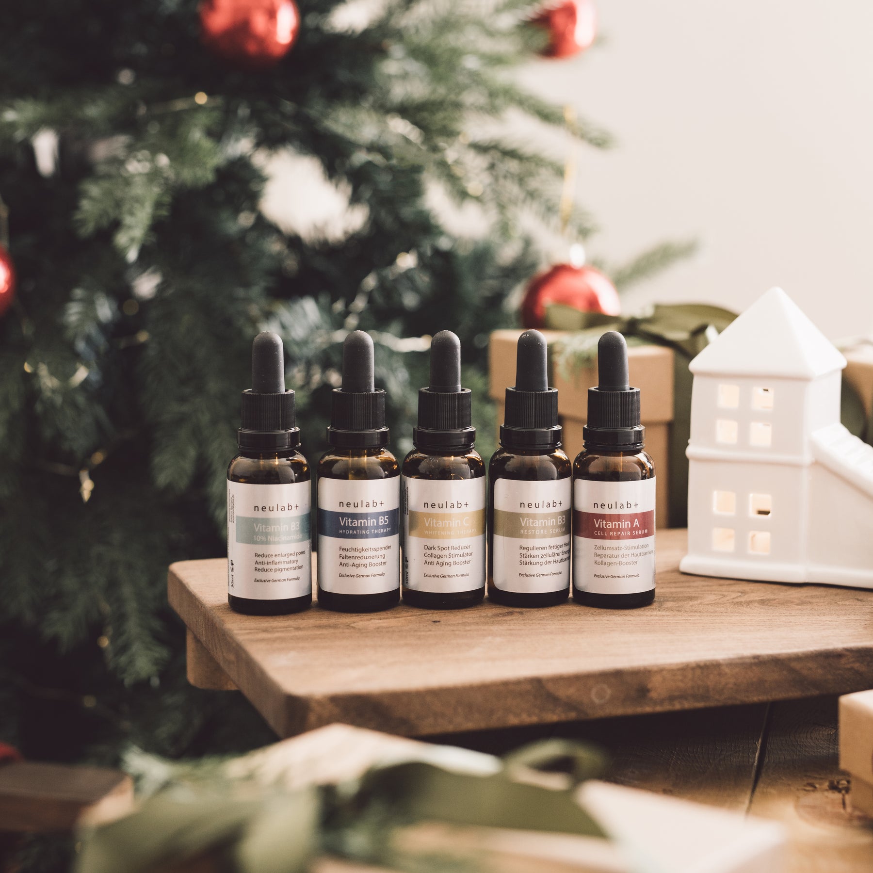礦物水、甘油、乙基維他命C 、抗壞血酸葡萄糖苷、維他命C磷酸鈉鹽 、乙基己基甘油、乳酸鈉、黃原膠、谷氨酸二乙酸四鈉、氫氧化鈉、甲基丙二醇、檸檬酸、天然香料